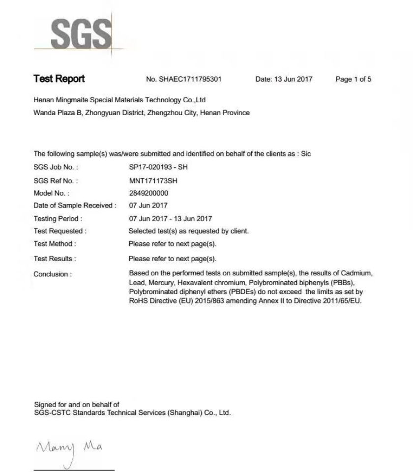 碳化硅的使用與應(yīng)用目前在國(guó)內(nèi)諸多行業(yè)當(dāng)中已經(jīng)非常普遍。由于國(guó)外的客戶(hù)訂單當(dāng)中一般以第三方mdms檢測(cè)為依據(jù)。而正規(guī)的國(guó)際認(rèn)證的提供較少。所以我們?cè)诹轮髮?duì)公司的碳化硅進(jìn)行了國(guó)際危險(xiǎn)成分RoHs六項(xiàng)檢測(cè)其中包括(鎘、鉛、汞、鉻的結(jié)果,多溴聯(lián)苯(PBBs)、多溴聯(lián)苯醚(PBDEs)不超過(guò)規(guī)定的限制(歐盟)2015、863修訂第2011、65、歐盟附件五。