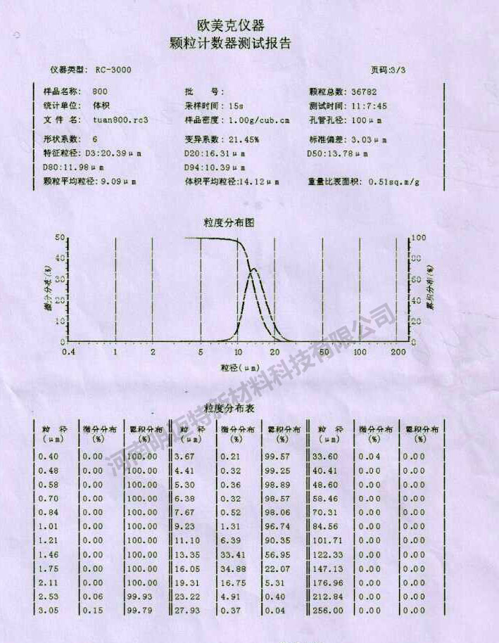 如上圖碳化硅檢測標準為例:RC-3000是檢測儀器的型號類型。樣品名稱也就是碳化硅的目數。而中間粒徑分布圖也稱之為分散圖,